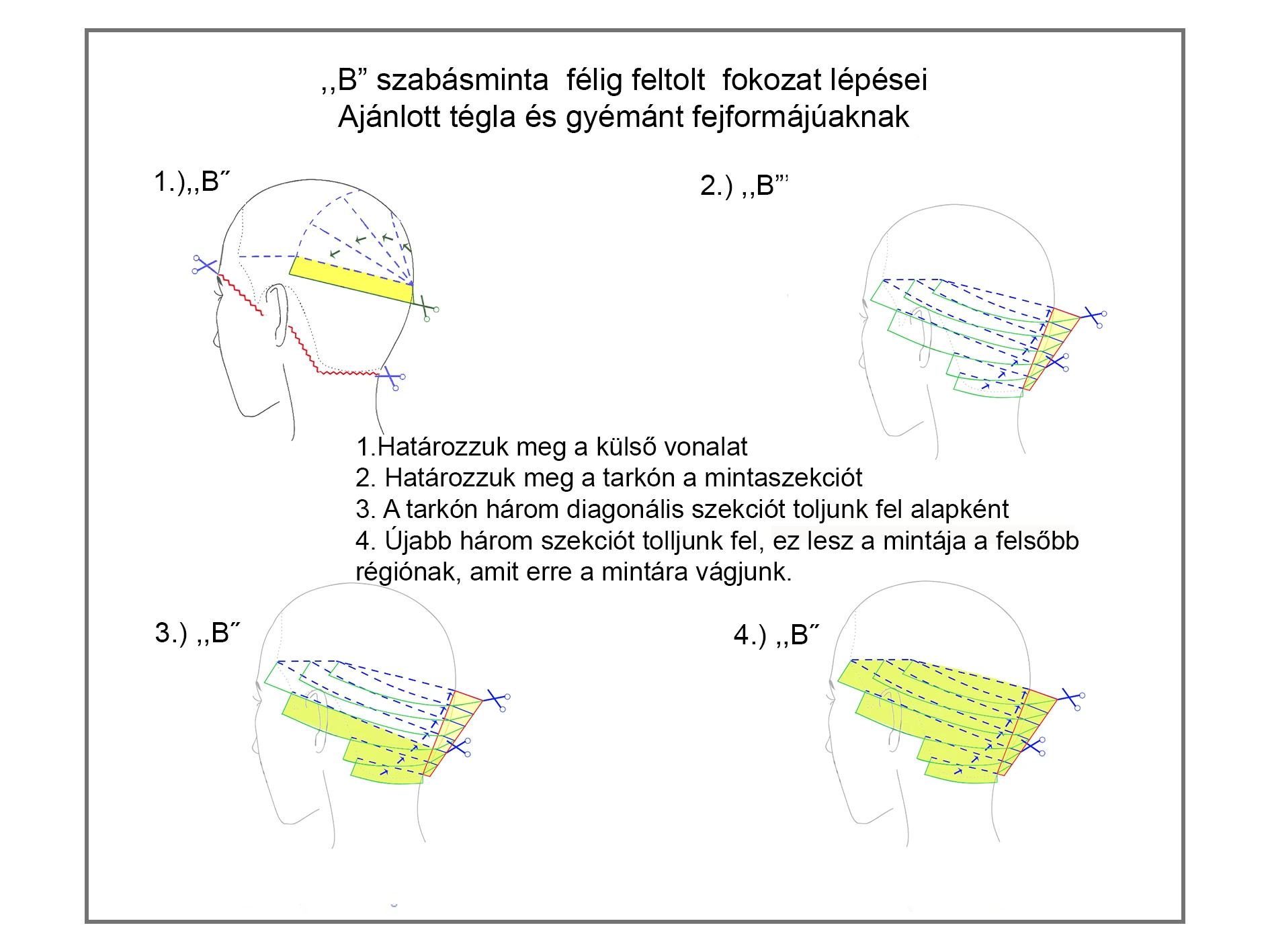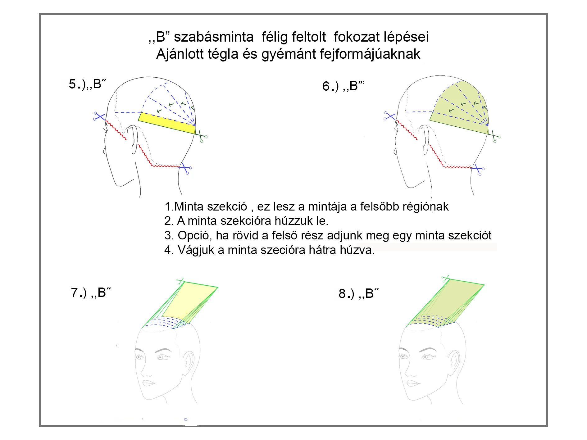 - „B” a fokozatos vágást jelenti, diagonális leválasztásokkal. (A fej középső részén alkalmazzuk). 1. hátrahúzás 65 fokban, 2. oldalra húzás 65 fokban, 3. előretolás 65 fokban, 4. bőrön feltolt fokozat.)