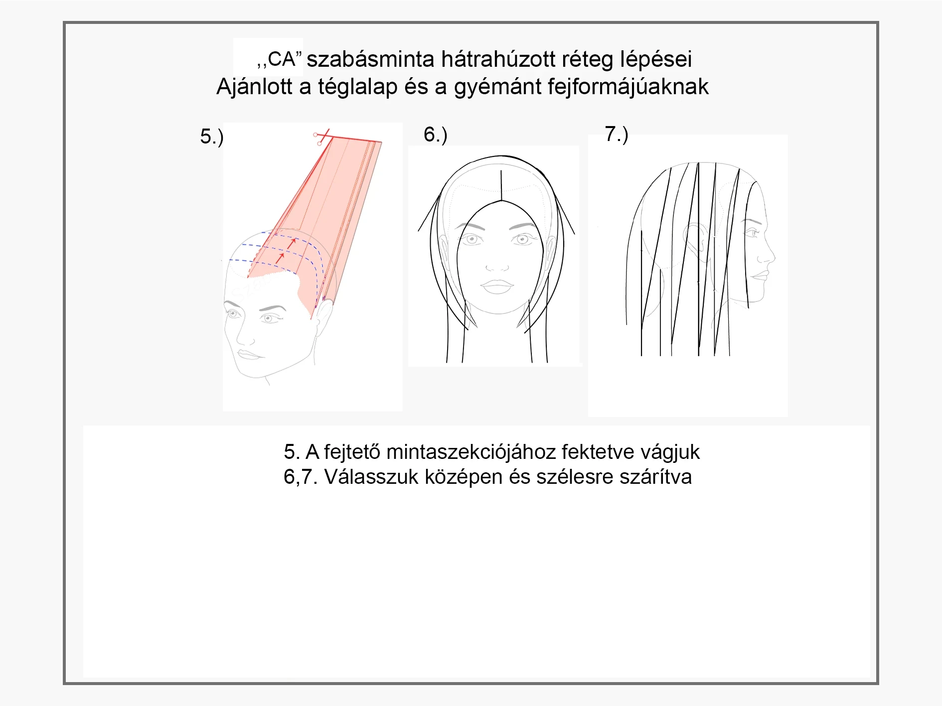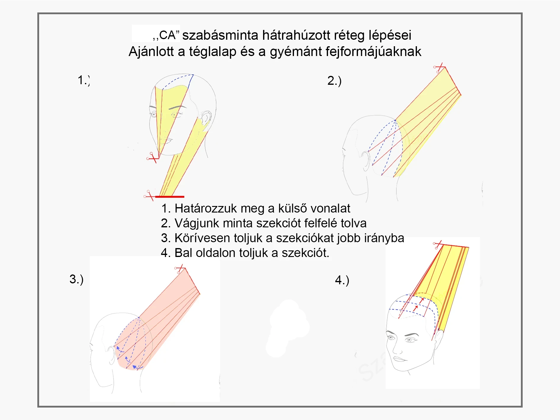 A szabásminta az ,,ABC” vágótechnikákból áll. A vágótechnika pedig fogásokból. Mutatjuk az "CA" szabásmintát: