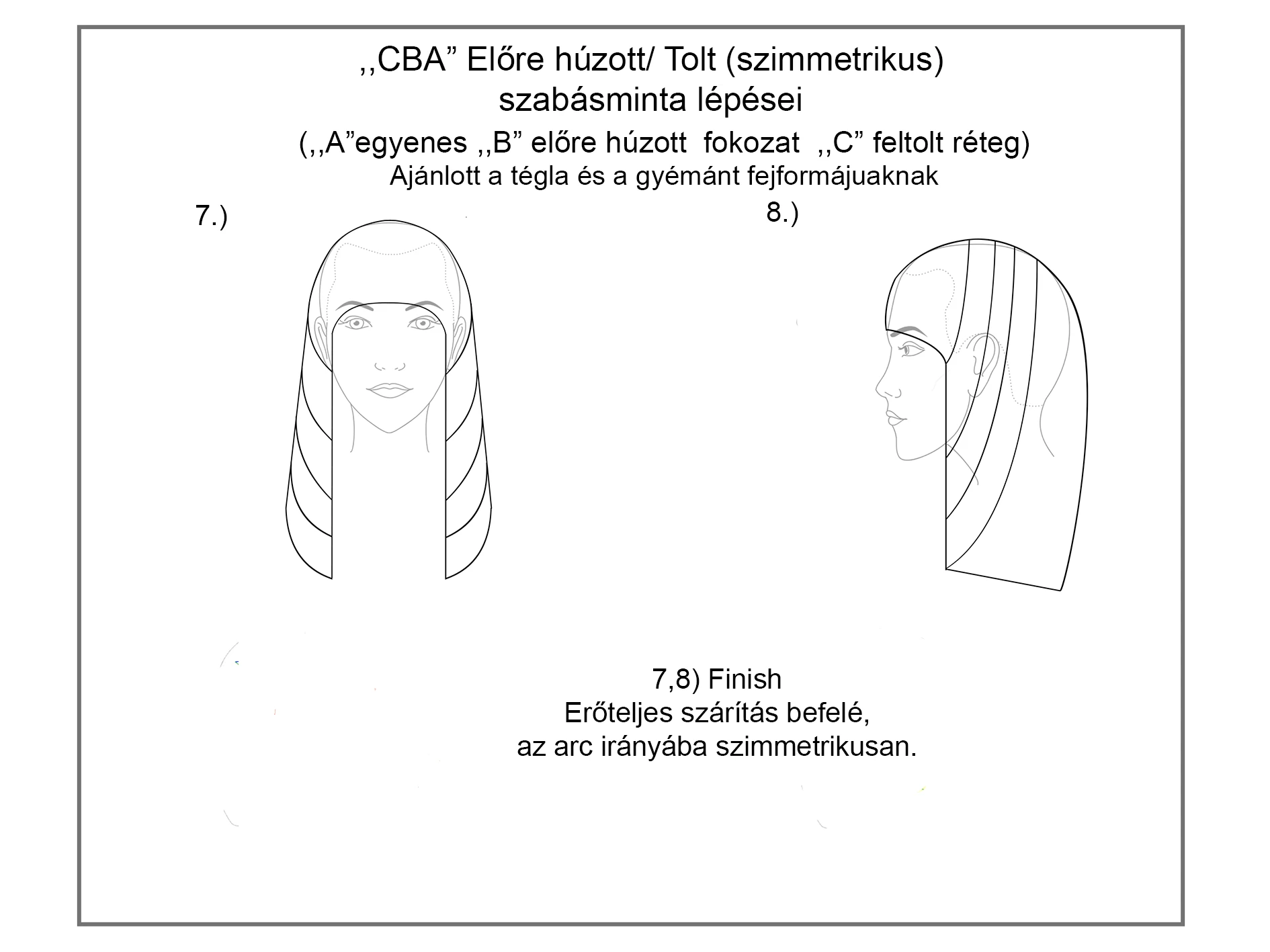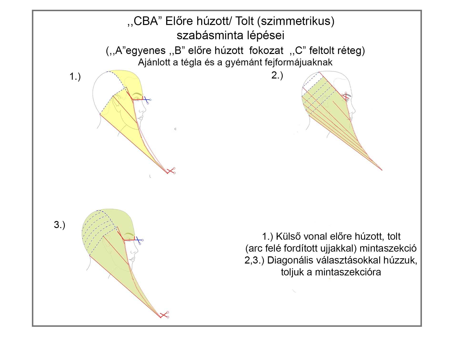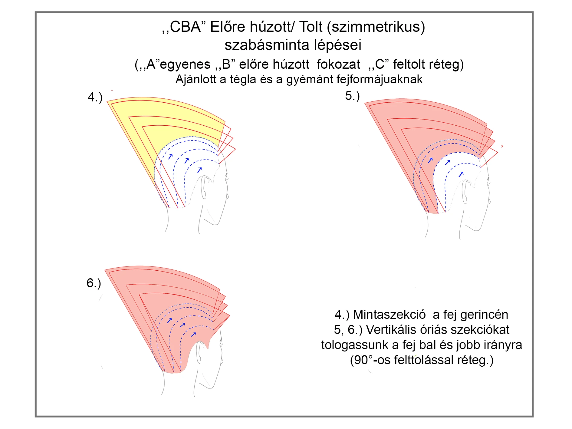 A szabásminta az ,,ABC” vágótechnikákból áll. A vágótechnika pedig fogásokból. Mutatjuk az "CBA" szabásmintát: