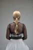 2. lépés: A tarkó közepén tiszta, nem túl szoros copfot készítünk.
