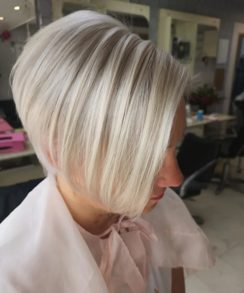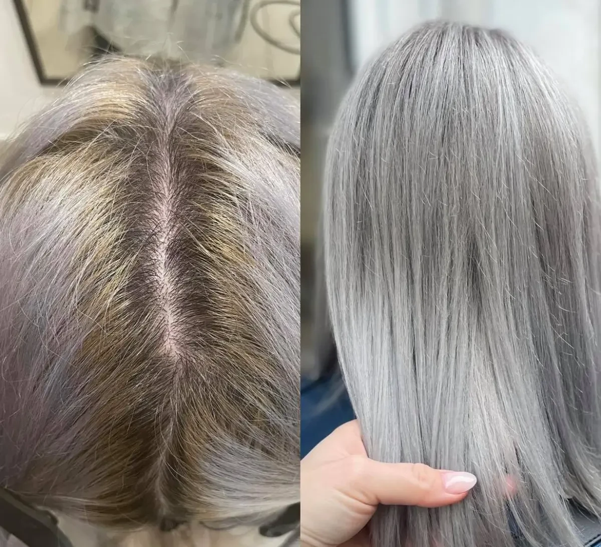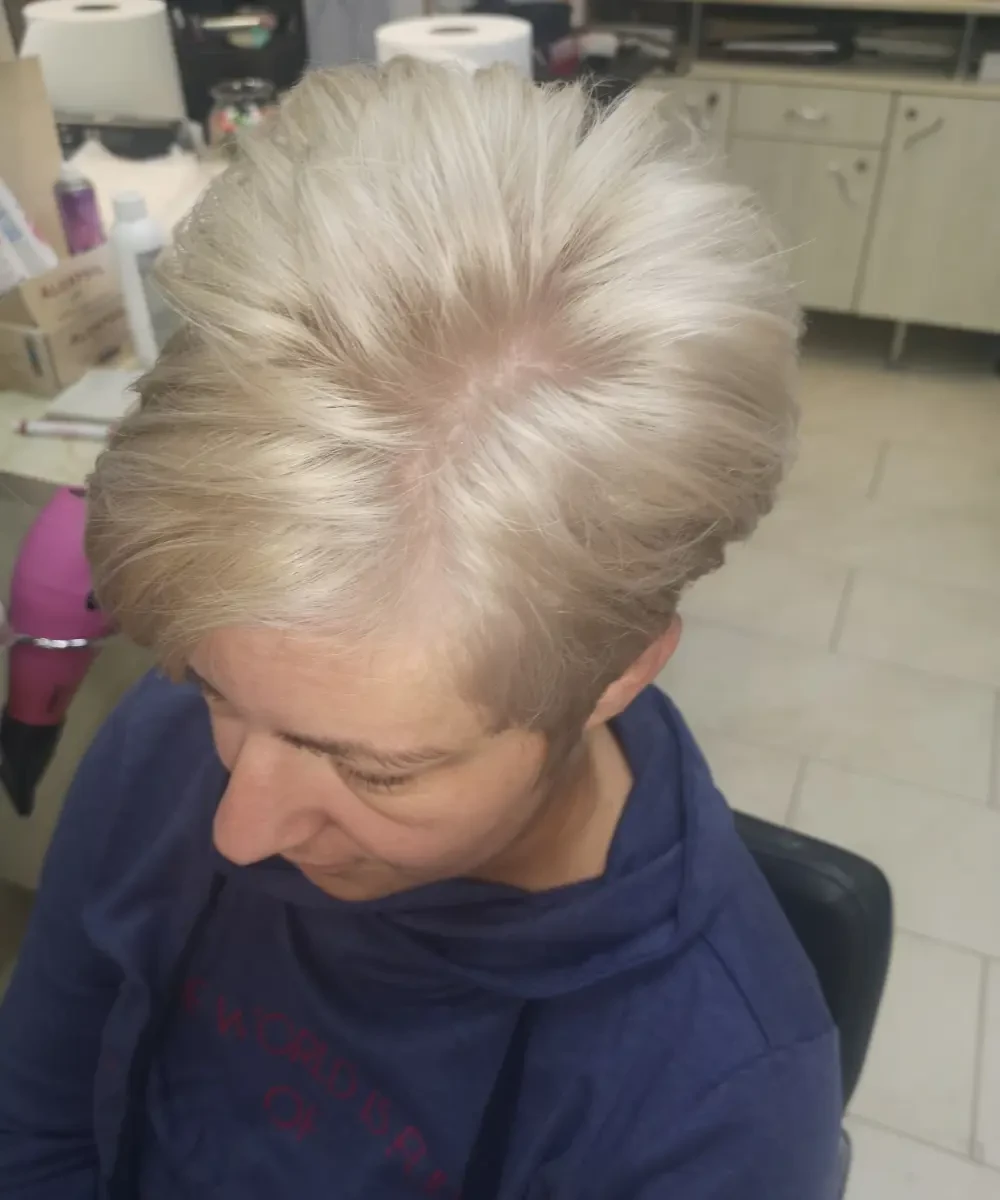 “A vendégem előző napon szedette le a póthaját, így letört hajjal érkezett hozzám. A tövét leszőkítettem, mert ragaszkodott a nagyon világos hajhoz; 010P-t használtam. Amikor feltettem nagyon izgultam, mert kékben és lilában pompázott a haja, de kis idő múlva elkezdett gyönyörű ezüstössé válni. Ezzel a színezővel megtörtént a csoda: vendégem puha, fényes könnyen kezelhető hajjal távozott.”